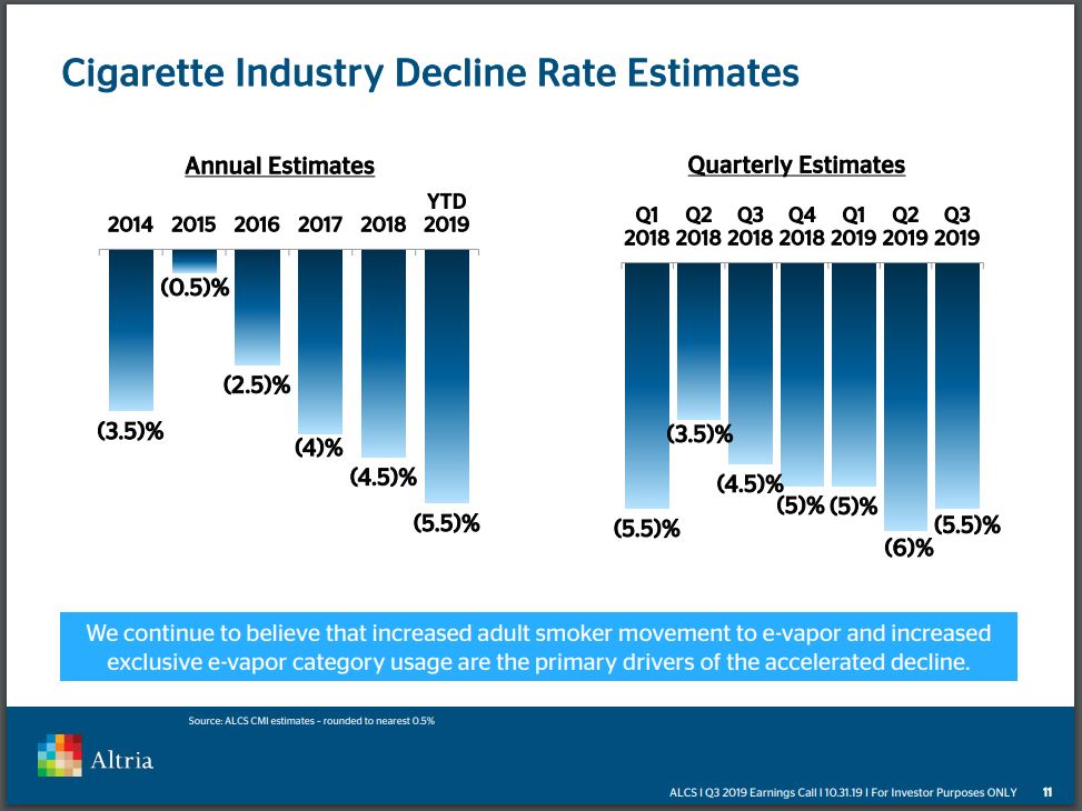 It also reassures investors that at this time there is no reason to think that vaping will lead too many smokers to quit any time soon. “We reaffirm our 2019 U.S. cigarette industry volume decline estimate of 5% to 6% and maintain our compounded annual average U.S. cigarette industry volume decline estimate through 2023 of 4% to 6%.” |