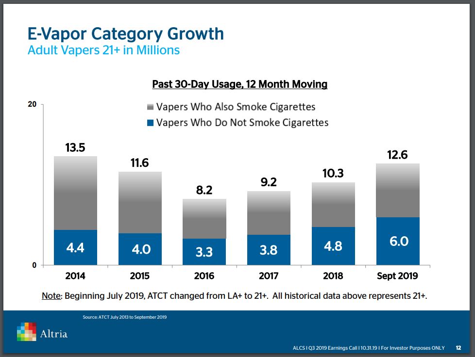 | #2: Cigarette sales are dropping: – for every 20 cigarettes smoked last year, this year there are only 19. Volume sales of cigarettes in the United States are down more than 5% this year compared with last — a greater dip than in any other of the past 5 years. That’s the equivalent of 1 less cigarette in every package in 2019, compared with 1 less cigarette in every carton in 2015.The reason? Altria says it is because smokers are substituting some cigarettes with e-cigarettes and because some smokers have completely switched to vaping. “We continue to believe that increased adult smoker movement to e-vapor and increased exclusive e-vapor category usage are the primary drivers of the accelerated decline.”  |