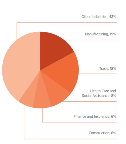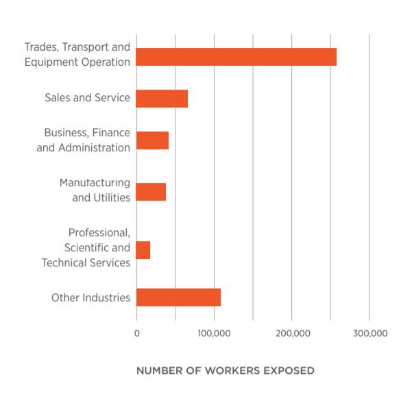 Despite a legislated smoking ban in indoor workplaces, CAREX Canada estimates that exposure still occurs and approximately 520,000 Canadian workers are exposed to second-hand smoke in their workplaces (131). The proportion of workers exposed to second-hand smoke varies by occupation (Figure 25). The sectors with the largest number of workers exposed to second-hand smoke include: trades, transport and equipment operations, where approximately 50% of exposure occurs, followed by sales and service industry (13% of all exposed workers). The largest number of exposed workers are employed in Ontario, Quebec and Alberta. |