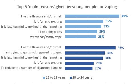 The most frequently-cited “main reason” of teenagers and young adults for vaping is because they “like the flaours and/or smell.” Other key reasons are that “it is fun and exciting” and belief that these products are less harmful than cigarettes.
