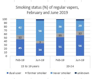 More than one half (56%) of young vapers (age 15-19) and almost one-third (29%) of young adult vapers (age 20-24) are non smokers (have never tried a cigarette, or smoked fewer than 100 in their lifetime). The proportion of young people who had never smoked grew between February and June, 2019.