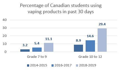 The number of grade 10 and 11 students who had ever tried an e-cigarette jumped from one-third (33%) to almost one half (47%). The number of current users (those who have vaped in the past 30 days) doubled from 15% to 30%.