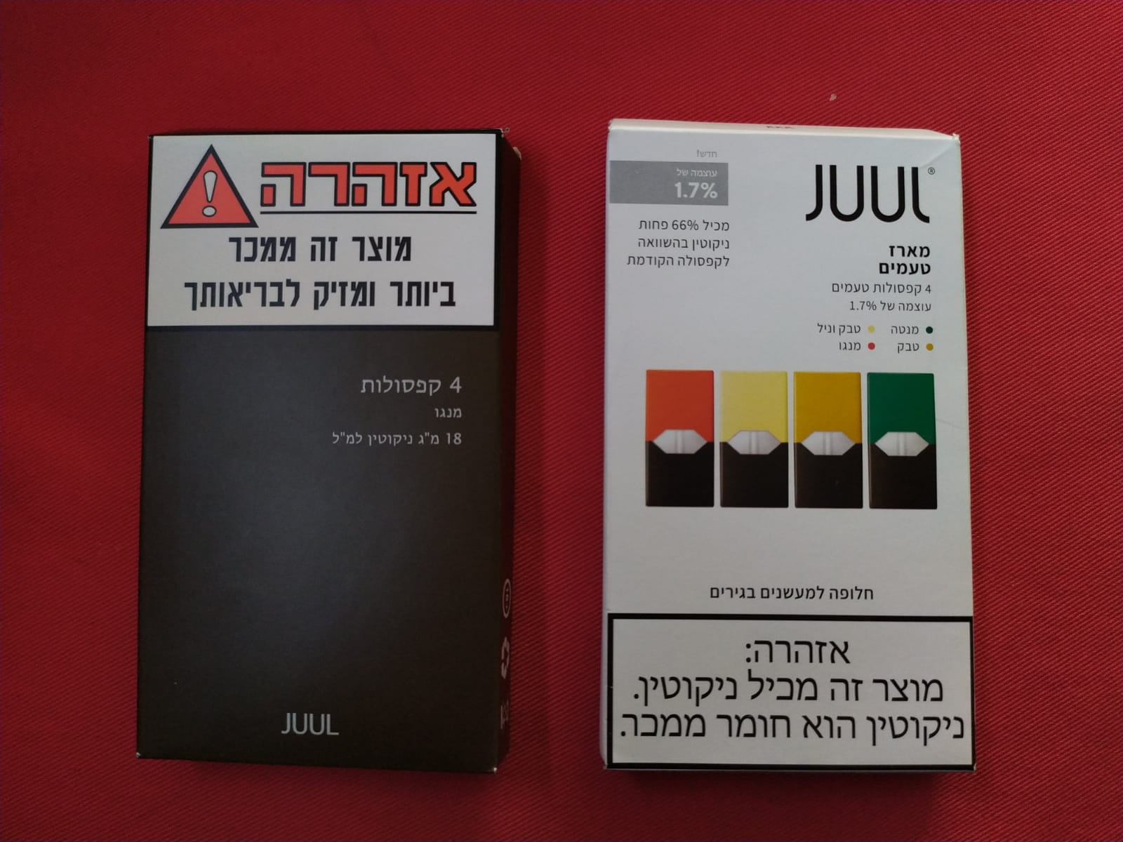 The picture above, showing a before and after package of JUUL cartridge mix in Israel, is provided with the kind permission of Smoke-Free Israel.