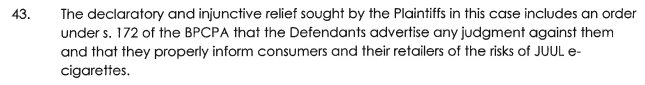 One class action has been filed against JUUL in British Columbia, claiming that the company made false representations about the safety of their products and failed to warn about the risks of their products in ways that went against that province’s Business Practices and Consumer Protection Act. In addition to asking for compensation for injuries, the class action is also asking the courts to require that JUUL change its marketing practices. (Other class actions may be in the works).