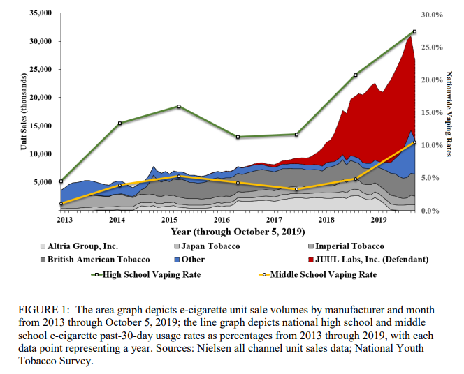 While the sales of products by other companies was relatively stable over most of the decade, it was the accelerated marketing of JUUL after 2017 that is associated with the growth in the market and also the growth in youth use, as shown in a figure from the Pennsylvania claim.