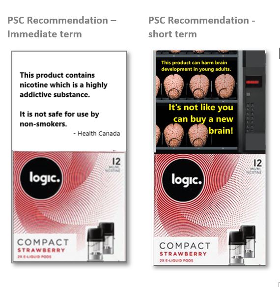 For that reason, we are proposing that in the short run, Health Canada require a strengthened and more prominent version of its warning be on all packages as soon as possible. Within the next year, however, it should be possible to refine and adapt a series of rotating messages which provide Canadians with the information about the range of health risks associated with vaping to which they are entitled. One of our suggestions on how to do this is shown below.